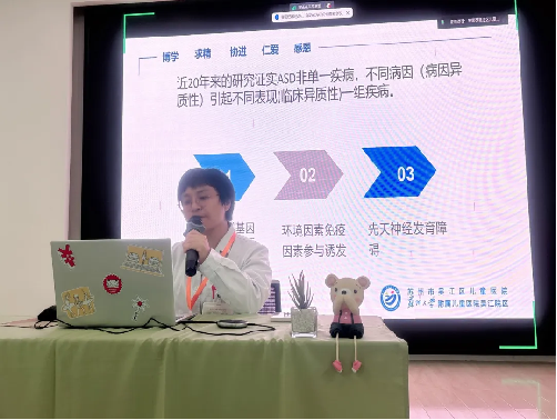 活动中黎里幼儿园沈方勤园长为活动致辞。沈园长介绍了黎里幼儿园融合资源中心自2019年成立以来的实践探索之路,同时呼吁大家关心关爱星星的孩子,加入帮助他们的行列中来。吴江区儿童医院宋国英主任医师向大家作“儿童孤独症的早期关注”专题讲座。宋医生从ASD流行病学、病因和发病机制、临床表现与早期医学诊断治疗、预防和关爱预后四个方面进行了专业介绍和解读,为家长、老师、保育员、保健老师进行日常的儿童保育教育提供了借鉴,同时也为黎里幼儿园融合教育的有效开展提供了依据指导。讲座后宋主任医师团队接受家长咨询,并为黎里幼儿园特殊需要儿童进行义诊,医教结合,加强融合教育科普宣传。